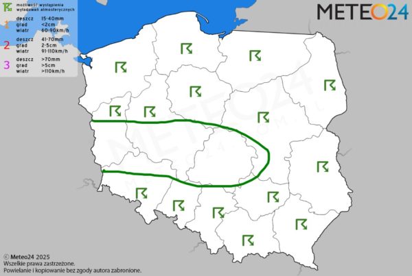 Opis: W ciągu doby nad wodami Morza Bałtyckiego oraz na przeważającym obszarze kraju za wyjątkiem częściowo zachodniej  i Centralnej Polski ponownie będą mogły przemieszczać się pojedyncze komórki burzowe lub pasma konwekcyjne. Dodatkowo w tej części obszaru pojawią się też przelotne oraz ciągłe opady deszczu o zmiennym i silnym natężeniu. W zamian tego podczas ich występowania niewykluczone są między innymi lokalne wyładowania atmosferyczne z opadami gradu lub krupy śnieżnej. Poza tym podczas burz wystąpi także umiarkowany i silny wiatr, który w porywach może dochodzić do 60-80 km/h. Ponadto z dobrze rozwiniętych chmur burzowych niewkluczone są także pojedyncze zalążki kondensacyjne lub trąby powietrzne
