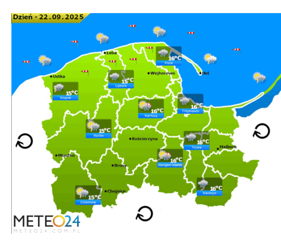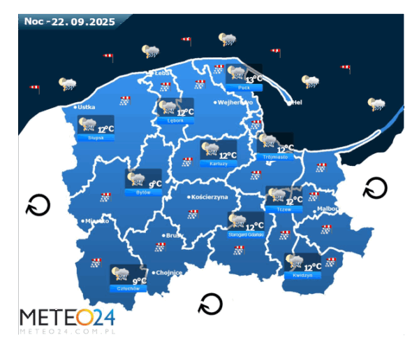 Z kolei w poniedziałek przed południem oraz w ciągu dnia i wieczorem na Pomorzu i Wybrzeżu nadal mogą rozwijać się silne mgły i zamglenia. Poza tym pojawi się umiarkowane oraz całkowite i duże zachmurzenie z przejaśnieniami, które przyniesie ze sobą kolejne przelotne oraz ciągłe opady deszczu o zmiennym i silnym natężeniu. Dodatkowo nad wodami Morza Bałtyckiego oraz na zachodzie i północnym zachodzie województwa niewykluczone są też lokalne burze. Temperatura powietrza wyniesie od +15°C do +16°C. Wiatr na ogół będzie słaby oraz umiarkowany i dość silny ze zmiennych kierunków z przewagą wiejący od północnego – zachodu oraz z zachodu i południowego – zachodu. W zamian tego w porywach będzie on dochodzić do 30-60 km/h. Ciśnienie atmosferyczne w kolejnych godzinach nadal będzie rosnąć oraz w południe na poziomie morza wskaże 1016 hPa.