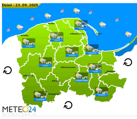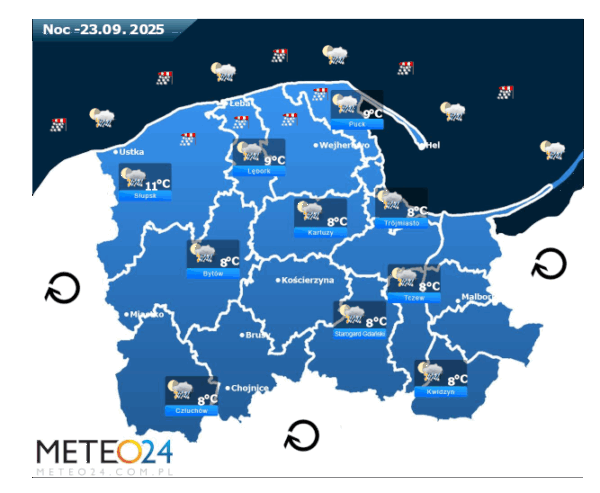 Z kolei we wtorek przed południem oraz w ciągu dnia i wieczorem na Pomorzu i Wybrzeżu nadal mogą rozwijać się silne mgły i zamglenia. Poza tym utrzyma się z nami umiarkowane i duże zachmurzenie z przejaśnieniami, które przyniesie ze sobą kolejne przelotne oraz ciągłe opady deszczu o zmiennym i silnym natężeniu. Dodatkowo niewykluczone są też burze z opadami gradu. Temperatura powietrza wyniesie od +14°C do +16°C. Wiatr na ogół będzie słaby oraz umiarkowany i dość silny ze zmiennych kierunków z przewagą wiejący od zachodu oraz z południowego – zachodu i północnego – zachodu. W zamian tego w porywach będzie on dochodzić do 30-60 km/h. Ciśnienie atmosferyczne w kolejnych godzinach również będzie rosnąć oraz w południe na poziomie morza wskaże 1021 hPa.