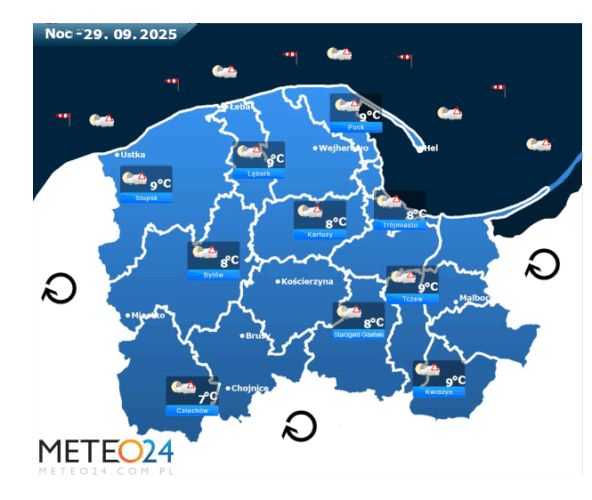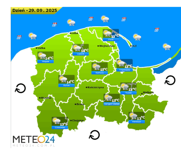 Z kolei w poniedziałek przed południem oraz w ciągu dnia i wieczorem na Pomorzu i Wybrzeżu ponownie mogą rozwijać się silne mgły i zamglenia. Poza tym pojawi się małe oraz umiarkowane i duże zachmurzenie z przejaśnieniami, które przyniesie ze sobą przelotne opady deszczu o zmiennym i silnym natężeniu. Dodatkowo niewykluczone są też lokalne burze z gradem. Temperatura powietrza wyniesie od +13°C do +14°C. Wiatr na ogół będzie słaby oraz umiarkowany i dość silny ze zmiennych kierunków z przewagą wiejący ze wschodu oraz z południowego – wschodu i północnego – wschodu. W zamian tego w porywach będzie on dochodzić do 30-60 km/h. Ciśnienie atmosferyczne w kolejnych godzinach nadal będzie wysokie oraz w południe na poziomie morza wskaże 1028 hPa.