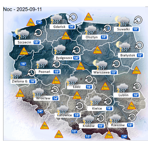 Natomiast w środę wieczorem oraz w czwartek w ciągu nocy i o poranku w całym naszym kraju oraz nad morzem i w górach nadal mogą rozwijać się silne mgły i zamglenia. W zamian tego pojawi się całkowite i duże zachmurzenie z przejaśnieniami, które przyniesie ze sobą przelotne oraz ciągłe opady deszczu o zmiennym i silnym natężeniu. Dodatkowo niewykluczone są też burze z opadami gradu. Temperatura powietrza wyniesie od +13°C do +16°C. Wiatr na ogół będzie słaby oraz umiarkowany i silny ze zmiennych kierunków z przewagą wiejący od południowego – wschodu oraz ze wschodu i z północy. Poza tym w porywach na Bałtyku i podczas burz będzie on dochodzić do 60-80 km/h. Ciśnienie atmosferyczne w kolejnych godzinach będzie spadać oraz o północy w Warszawie nad poziomem morza wskaże 1012 hPa.
