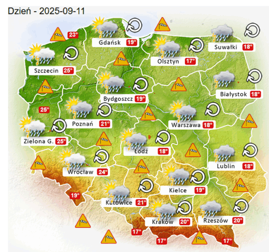 Z kolei w czwartek przed południem oraz w ciągu dnia i wieczorem w całym naszym kraju oraz nad morzem i w górach ponownie mogą rozwijać się silne mgły i zamglenia. Poza tym pojawi się całkowite oraz umiarkowane i duże zachmurzenie z przejaśnieniami, które przyniesie ze sobą kolejne przelotne oraz ciągłe opady deszczu o zmiennym i silnym natężeniu. Dodatkowo niewykluczone są też burze z opadami gradu. Temperatura powietrza wyniesie od +17°C do +25°C. Wiatr na ogół będzie słaby oraz umiarkowany i silny ze zmiennych kierunków z przewagą wiejący od południowego – wschodu oraz z północy i południowego – zachodu. W zamian tego w porywach na Bałtyku i podczas burz będzie on dochodzić do 60-80 km/h. Ciśnienie atmosferyczne w kolejnych godzinach zacznie powoli już rosnąć oraz w południe w Warszawie nad poziomie morza wskaże 1009 hPa.