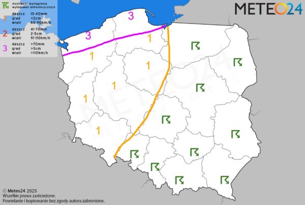 Opis: W ciągu doby szczególnie nad wodami Morza Bałtyckiego oraz na zachodzie i północy Polski gdzie został wydany pierwszy i najwyższy trzeci stopień będą rozwijać się pojedyncze komórki burzowe lub pasma konwekcyjne. Dodatkowo w tej części obszaru pojawią się też przelotne oraz ciągłe opady deszczu o zmiennym i silnym natężeniu. W zamian tego podczas ich występowania niewykluczone są między innymi wyładowania atmosferyczne z opadami gradu do 1-5 cm. Poza tym podczas burz wystąpi także bardzo silny i porywisty wiatr, który w porywach może dochodzić do 90-125 km/h. Ponadto z dobrze rozwiniętych chmur burzowych niewkluczone są także pojedyncze zalążki kondensacyjne lub trąby powietrzne. Z kolei nad ciepłymi wodami Bałtyku nie można również wykluczyć pojedynczych albo kilku trąb wodnych czy też lejków kondensacyjnych. Z kolei na pozostałym obszarze kraju i w górach również możliwe są opady konwekcyjne i im towarzyszące umiarkowane i dość silne porywy wiatru dochodzące do 60-80 km/h. Ponadto w tej części obszaru będą mogły wystąpić niezbyt liczne i na ogół słabe wyładowania atmosferyczne.