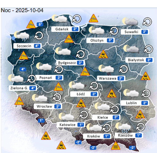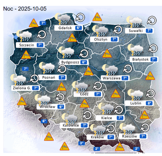 Natomiast w sobotę wieczorem oraz w niedzielę w ciągu nocy i o poranku w całym naszym kraju oraz nad morzem i w górach nadal mogą rozwijać się silne mgły i zamglenia. Poza tym utrzyma się z nami umiarkowane i duże zachmurzenie z przejaśnieniami, które przyniesie ze sobą przelotne oraz ciągłe opady deszczu o zmiennym i silnym natężeniu. Dodatkowo niewykluczone są też burze z opadami gradu lub krupy śnieżnej. Temperatura powietrza wyniesie od +3°C do +8°C. Wiatr na ogół będzie umiarkowany oraz silny i porywisty ze zmiennych kierunków z przewagą wiejący od południowego – zachodu oraz z południowego – wschodu i zachodu. W zamian tego w porywach będzie on dochodzić do 60-80 km/h. Ciśnienie atmosferyczne w kolejnych godzinach nadal będzie spadać i się wahać oraz o północy w Warszawie nad poziomem morza wskaże 1004 hPa.