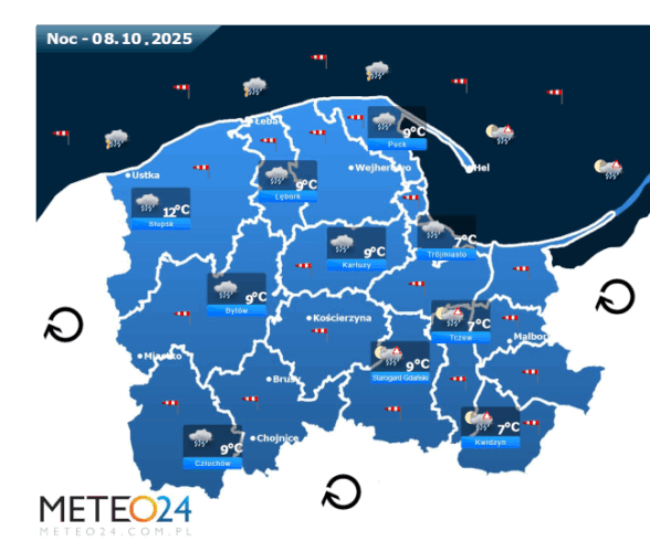 Natomiast we wtorek wieczorem oraz w środę w ciągu nocy i o poranku na Pomorzu i Wybrzeżu nadal mogą rozwijać się silne mgły i zamglenia. Poza tym pojawi się całkowite i duże zachmurzenie z przejaśnieniami, które przyniesie ze sobą kolejne przelotne oraz ciągłe opady deszczu o zmiennym i silnym natężeniu. Dodatkowo nad południowym Bałtykiem i częściowo w pasie nadmorskim niewykluczone są też lokalne burze. Temperatura powietrza wyniesie od +7°C do +12°C. Wiatr na ogół będzie słaby oraz umiarkowany i dość silny ze zmiennych kierunków z przewagą wiejący od południowego – zachodu oraz z południa i południowego – wschodu. W zamian tego w porywach będzie on dochodzić do 30-60 km/h. Ciśnienie atmosferyczne w kolejnych godzinach będzie się wahać i spadać oraz o północy na poziomie morza wskaże 1023 hPa.