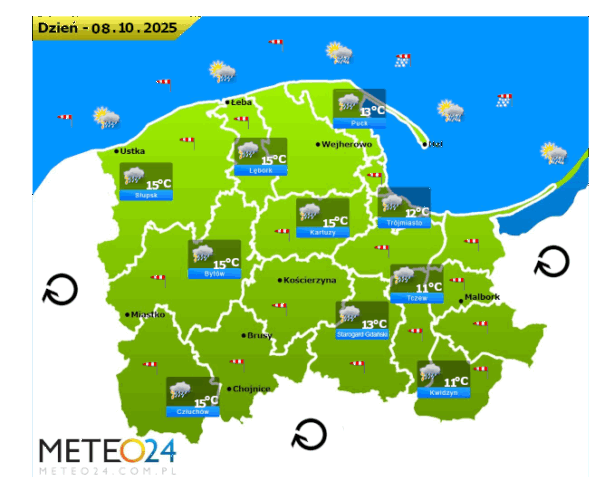 Z kolei w środę przed południem oraz w ciągu dnia i wieczorem na Pomorzu i Wybrzeżu ponownie mogą rozwijać się silne mgły i zamglenia. Poza tym utrzyma się z nami całkowite i duże zachmurzenie z przejaśnieniami, które przyniesie ze sobą kolejne przelotne oraz ciągłe opady deszczu o zmiennym i silnym natężeniu. Dodatkowo niewykluczone są też lokalne burze z gradem lub krupą śnieżną. Temperatura powietrza wyniesie od +11°C do +15°C. Wiatr na ogół będzie słaby oraz umiarkowany i dość silny ze zmiennych kierunków z przewagą wiejący od południowego – zachodu oraz z zachodu i północnego – zachodu. W zamian tego w porywach będzie on dochodzić do 30-60 km/h. Ciśnienie atmosferyczne w kolejnych godzinach będzie dość stabilne oraz w południe na poziomie morza wskaże 1018 hPa.