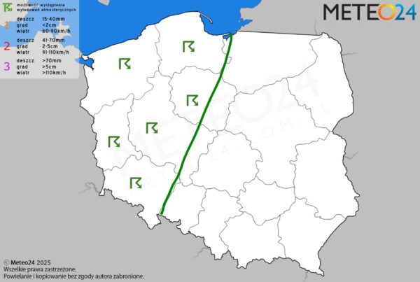 Opis: W ciągu doby na zachodzie Polski i Pomorzu będą rozwijać się pojedyncze komórki burzowe lub pasma konwekcyjne. Dodatkowo w tej części obszaru pojawią się też przelotne oraz ciągłe opady deszczu i deszczu ze śniegiem o zmiennym i silnym natężeniu. W zamian tego podczas ich występowania niewykluczone są między innymi lokalne wyładowania atmosferyczne z opadami gradu lub krupy śnieżnej. Poza tym podczas burz wystąpi także umiarkowany i silny wiatr, który w porywach może dochodzić do 60-80 km/h. Ponadto z dobrze rozwiniętych chmur burzowych niewkluczone są także pojedyncze zalążki kondensacyjne lub trąby powietrzne. Z kolei nad morzem nie można również wykluczyć pojedynczych albo kilku trąb wodnych czy też lejków kondensacyjnych.