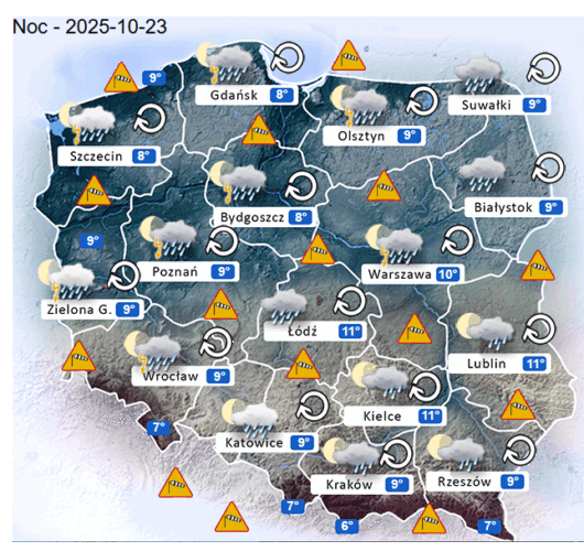 Natomiast w środę wieczorem oraz w czwartek w ciągu nocy i o poranku w całym naszym kraju oraz nad morzem i w górach ponownie mogą rozwijać się silne mgły i zamglenia. W zamian tego utrzyma się z nami całkowite oraz umiarkowane i duże zachmurzenie z przejaśnieniami, które przyniesie ze sobą przelotne oraz ciągłe opady deszczu lub mżawki o słabym i silnym natężeniu. Dodatkowo niewykluczone są też lokalne burze z gradem lub krupą śnieżną. Temperatura powietrza wyniesie od +6°C do +11°C. Wiatr na ogół będzie słaby oraz umiarkowany i dość silny ze zmiennych kierunków z przewagą wiejący od południa oraz z południowego – wschodu i południowego – zachodu. Poza tym w porywach będzie on dochodzić do 30-60 km/h. Ciśnienie atmosferyczne w kolejnych godzinach nadal będzie niskie i spadające oraz o północy w Warszawie nad poziomem morza wskaże 1006 hPa.
