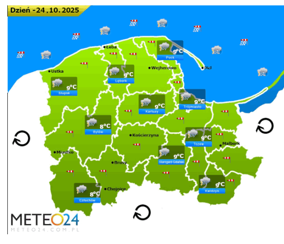 W kolejnych godzinach a dokładnie w piątek pogodę na Pomorzu i Wybrzeżu nadal kształtować będzie układ niskiego ciśnienia z frontami atmosferycznymi. Ponadto w dalszym ciągu występować będą opady deszczu z umiarkowanym i silnym wiatrem. Poza tym nad wody Morza Bałtyckiego i do północnej części Polski napływać będzie wilgotne i chłodne powietrze z południowego zachodu i północnego zachodu Europy.