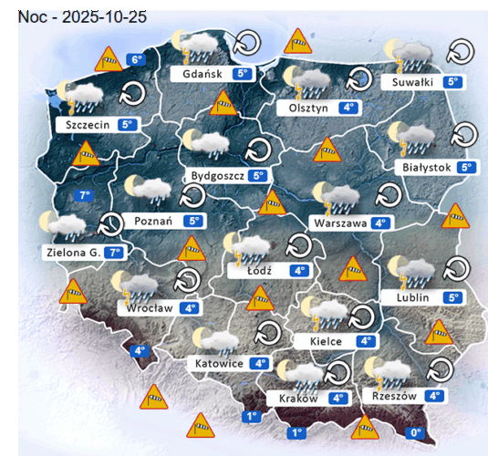 Natomiast w piątek wieczorem oraz w sobotę w ciągu nocy i o poranku w całym naszym kraju oraz nad morzem i w górach nadal możliwe są silne marznące mgły i zamglenia. W zamian tego utrzyma się z nami umiarkowane i duże zachmurzenie z przejaśnieniami, które przyniesie ze sobą przelotne oraz ciągłe opady deszczu i deszczu ze śniegiem o słabym i silnym natężeniu. Dodatkowo niewykluczone są też lokalne burze z gradem lub krupą śnieżną. Temperatura powietrza wyniesie od 0°C do +7°C. Wiatr przeważnie będzie słaby oraz umiarkowany i silny ze zmiennych kierunków z przewagą wiejący od południowego – zachodu oraz z zachodu i północnego – zachodu. Poza tym w porywach będzie on dochodzić do 60-90 km/h. Ciśnienie atmosferyczne w kolejnych godzinach będzie rosnąć oraz o północy w Warszawie nad poziomem morza wskaże 1002 hPa.