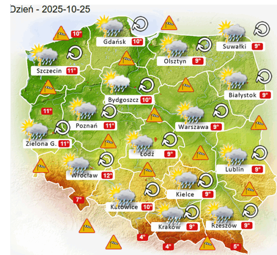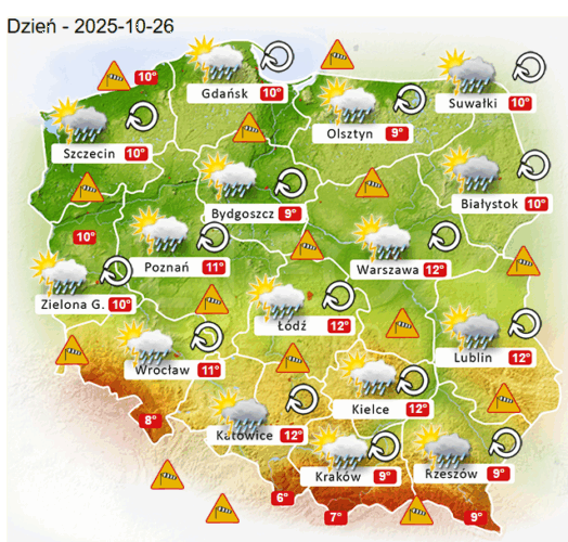 Z kolei w ostatni dzień weekendu przed południem oraz w ciągu dnia i wieczorem w całym naszym kraju oraz nad morzem i w górach ponownie możliwe są silne mgły i zamglenia. Poza tym utrzyma się z nami umiarkowane i duże zachmurzenie z przejaśnieniami, które przyniesie ze sobą kolejne przelotne oraz ciągłe opady deszczu o zmiennym i silnym natężeniu. Dodatkowo niewykluczone są też lokalne burze z gradem lub krupą śnieżną. Temperatura powietrza wyniesie od +6°C do +12°C. Wiatr nadal będzie będzie umiarkowany oraz bardzo silny i porywisty ze zmiennych kierunków z przewagą wiejący od południowego – zachodu oraz z południa i północnego – zachodu. W zamian tego w porywach będzie on dochodzić do 80-117 km/h. Ciśnienie atmosferyczne w kolejnych godzinach nadal będzie spadać i się wahać oraz w południe w Warszawie nad poziomem morza wskaże 1000 hPa.