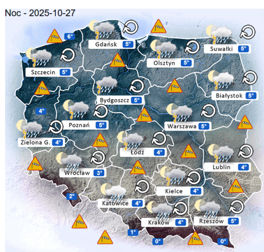 Natomiast w niedzielę wieczorem oraz w poniedziałek w ciągu nocy i o poranku w całym naszym kraju oraz nad morzem i w górach nadal mogą rozwijać się silne marznące mgły i zamglenia. W zamian tego utrzyma się z nami całkowite oraz umiarkowane i duże zachmurzenie z przejaśnieniami, które przyniesie ze sobą przelotne oraz ciągłe opady deszczu i deszczu ze śniegiem o zmiennym i silnym natężeniu. Dodatkowo niewykluczone są też burze z opadami gradu lub krupy śnieżnej. Temperatura powietrza wyniesie od 0°C do +5°C. Wiatr na ogół będzie umiarkowany oraz silny i bardzo silny ze zmiennych kierunków z przewagą wiejący od południowego – zachodu oraz z południa i północnego – zachodu. Poza tym w porywach szczególnie nad morzem oraz w górach i na południu Polski będzie on dochodzić do nawet 90-110 km/h. Ciśnienie atmosferyczne w kolejnych godzinach będzie niskie i nadal wahające oraz o północy w Warszawie nad poziomem morza wskaże 997 hPa.