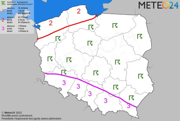 Opis: W ciągu doby szczególnie nad wodami Morza Bałtyckiego oraz w górach na północy i południu Polski oraz gdzie został ponownie wydany drugi i najwyższy trzeci stopień zagrożenia w dalszym ciągu będą rozwijać się pojedyncze komórki burzowe lub pasma konwekcyjne. Dodatkowo w tej części obszaru pojawią się też przelotne oraz ciągłe opady deszczu o zmiennym i silnym natężeniu. W zamian tego podczas ich występowania niewykluczone są między innymi wyładowania atmosferyczne z opadami gradu do 1-5 cm. Poza tym ich głównym zagrożeniem będzie silny i bardzo silny wiatr, który w porywach przy możliwej linii szkwału może tam dochodzić do nawet 110-120 km/h. Z kolei na pozostałym obszarze Polski i również możliwe są pojedyncze komórki burzowe, którym sprzyjać będzie umiarkowany i też silny wiatr w porywach do 60-80 km/h oraz między innymi pojawią się przelotne opady konwekcyjne.