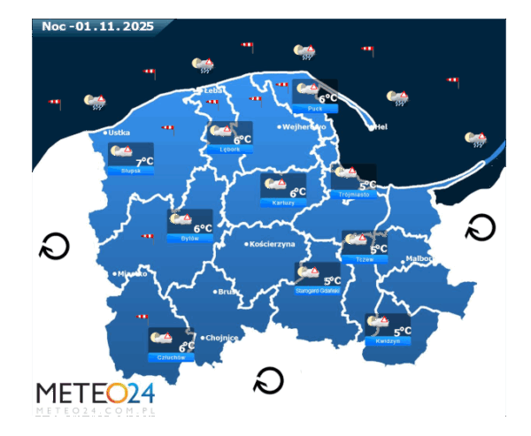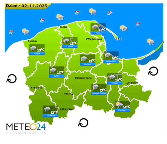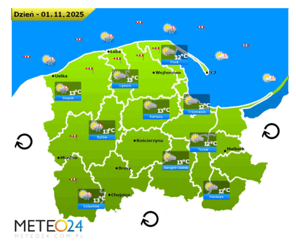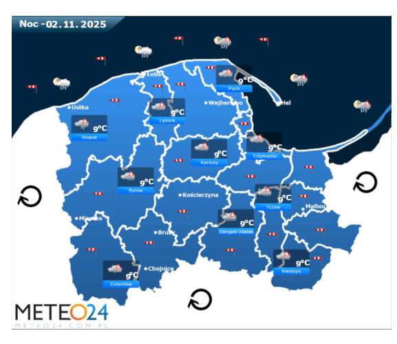 Z kolei we Wszystkich Świętych a dokładnie w sobotę przed południem oraz w ciągu dnia i wieczorem na Pomorzu i Wybrzeżu nadal mogą rozwijać się silne mgły i zamglenia. Poza tym utrzyma się z nami umiarkowane i duże zachmurzenie z przejaśnieniami, które jedynie nad wodami Morza Bałtyckiego oraz na północnym zachodzie i zachodzie województwa przyniesie ze sobą kolejne przelotne oraz ciągłe opady deszczu lub mżawki o zmiennym i silnym natężeniu. Temperatura powietrza wyniesie od +12°C do +13°C. Wiatr na ogół będzie słaby oraz umiarkowany i silny ze zmiennych kierunków z przewagą wiejący od południowego – wschodu oraz z południa i południowego – zachodu. W zamian tego w porywach będzie on dochodzić do 60-80 km/h. Ciśnienie atmosferyczne w kolejnych godzinach będzie się wahać i ponownie spadać oraz w południe na poziomie morza wskaże 1015 hPa.
