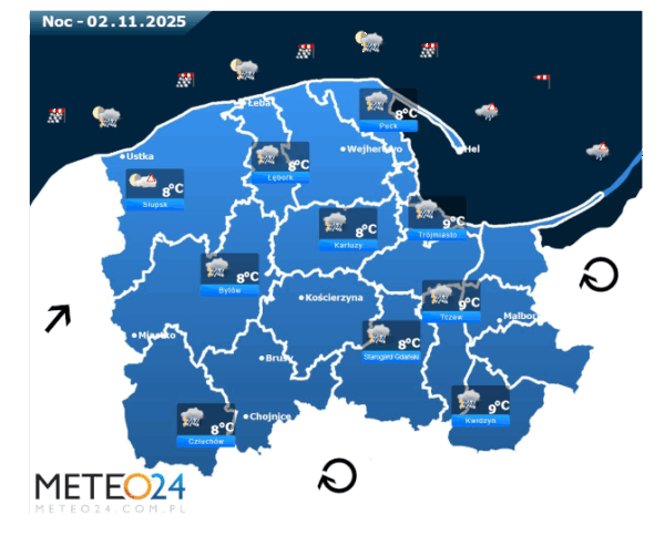 Z kolei w poniedziałek przed południem oraz w ciągu dnia i wieczorem na Pomorzu i Wybrzeżu nadal mogą rozwijać się silne mgły i zamglenia. Poza tym pojawi się umiarkowane i duże zachmurzenie z przejaśnieniami, które przyniesie ze sobą kolejne przelotne oraz ciągłe opady deszczu o zmiennym i silnym natężeniu. Dodatkowo niewykluczone są też lokalne burze z gradem lub krupą śnieżną. Temperatura powietrza wyniesie od +11°C do +13°C. Wiatr na ogół będzie słaby oraz umiarkowany i silny ze zmiennych kierunków z przewagą wiejący od południowego – zachodu i z zachodu. W zamian tego w porywach będzie on dochodzić do 60-80 km/h. Ciśnienie atmosferyczne w kolejnych godzinach będzie również rosnąć oraz w południe na poziomie morza wskaże 1016 hPa.