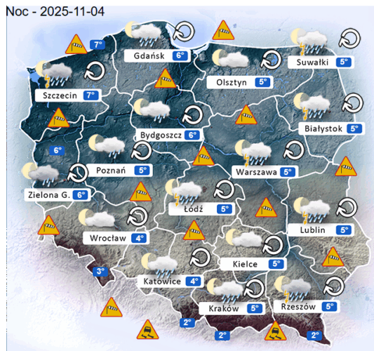 Natomiast w poniedziałek wieczorem oraz we wtorek w ciągu nocy i o poranku w całym naszym kraju oraz nad morzem i w górach nadal mogą rozwijać się silne mgły i zamglenia. W zamian tego utrzyma się z nami małe oraz umiarkowane i duże zachmurzenie z przejaśnieniami, które przyniesie ze sobą przelotne oraz ciągłe opady deszczu lub mżawki o słabym i silnym natężeniu. Dodatkowo niewykluczone są też lokalne burze z gradem lub krupą śnieżną. Jedynie bez opadów i burz powinno być częściowo w Centrum oraz na południowym zachodzie i północnym wschodzie Polski. Temperatura powietrza wyniesie od +2°C do +7°C. Wiatr na ogół będzie słaby oraz umiarkowany i dość silny ze zmiennych kierunków z przewagą wiejący od południowego – zachodu oraz z zachodu i północnego – zachodu. Poza tym w porywach będzie on dochodzić do 30-60 km/h. Ciśnienie atmosferyczne w kolejnych godzinach będzie rosnąć oraz o północy w Warszawie nad poziomem morza wskaże 1020 hPa.
