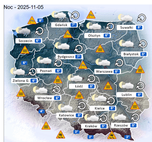 Z kolei w środę przed południem oraz w ciągu dnia i wieczorem w całym naszym kraju oraz nad morzem i w górach nadal mogą rozwijać się silne mgły i zamglenia. Poza tym utrzyma się z nami małe oraz umiarkowane i duże zachmurzenie z przejaśnieniami, które jedynie nad wodami Morza Bałtyckiego i w pasie nadmorskim przyniesie ze sobą kolejne przelotne opady słabe deszczu lub mżawki. Temperatura powietrza wyniesie od +10°C do +14°C. Wiatr na ogół będzie słaby oraz umiarkowany i dość silny ze zmiennych kierunków z przewagą wiejący od południowego – zachodu oraz z południa i południowego – wschodu. W zamian tego w porywach będzie on dochodzić do 30-60 km/h. Ciśnienie atmosferyczne w kolejnych godzinach ponownie będzie spadać i się wahać oraz w południe w Warszawie nad poziomem morza wskaże 1026 hPa.