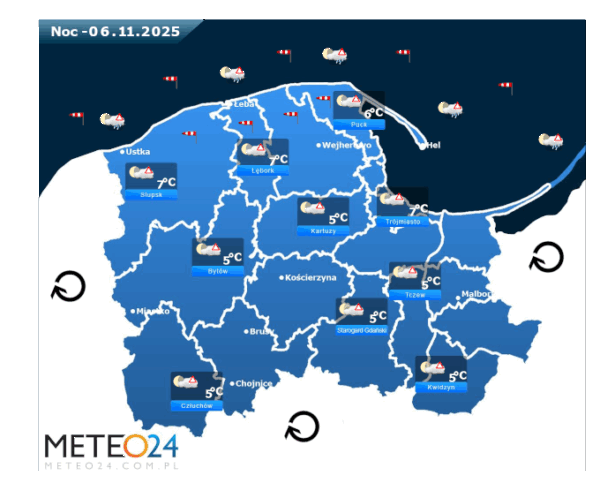 Natomiast w środę wieczorem oraz w czwartek w ciągu nocy i o poranku na Pomorzu i Wybrzeżu nadal mogą rozwijać się silne mgły i zamglenia. W zamian tego utrzyma się z nami małe i umiarkowane zachmurzenie, które jedynie nad wodami Morza Bałtyckiego i w pasie nadmorskim przyniesie ze sobą przelotne opady deszczu lub mżawki o słabym natężeniu. Temperatura powietrza wyniesie od +5°C do +7°C. Wiatr na ogół będzie słaby oraz umiarkowany i dość silny ze zmiennych kierunków z przewagą wiejący od południowego – zachodu oraz z południa i południowego – wschodu. Dodatkowo w porywach będzie on dochodzić do 30-60 km/h. Ciśnienie atmosferyczne w kolejnych godzinach będzie spadać i się wahać oraz o północy na poziomie morza wskaże 1020 hPa.