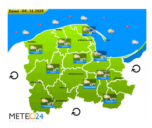 Z kolei w czwartek przed południem oraz w ciągu dnia i wieczorem na Pomorzu i Wybrzeżu ponownie mogą rozwijać się silne mgły i zamglenia. Poza tym pojawi się małe oraz umiarkowane i duże zachmurzenie z przejaśnieniami, które jedynie nad wodami Morza Bałtyckiego i w pasie nadmorskim przyniesie ze sobą przelotne opady deszczu lub mżawki o słabym i zmiennym natężeniu. Temperatura powietrza wyniesie od +12°C do +14°C. Wiatr na ogół będzie słaby oraz umiarkowany i dość silny ze zmiennych kierunków z przewagą wiejący od południowego – zachodu oraz z południa i południowego – wschodu. Dodatkowo w porywach będzie on dochodzić do 30-60 km/h. Ciśnienie atmosferyczne w kolejnych godzinach nadal będzie spadać i się wahać oraz w południe na poziomie morza wskaże 1019 hPa.
