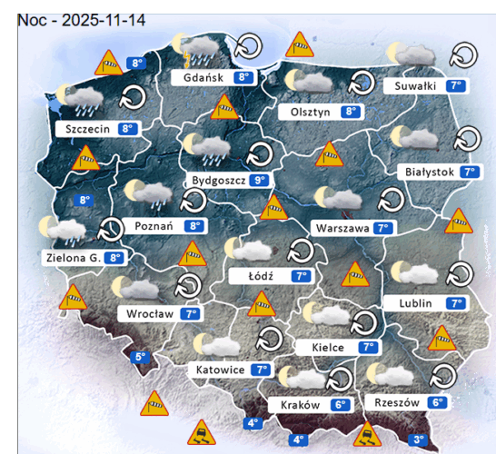 Natomiast w czwartek wieczorem oraz w piątek w ciągu nocy i o poranku w całym naszym kraju oraz nad morzem i w górach ponownie mogą rozwijać się silne mgły i zamglenia. W zamian tego utrzyma się z nami całkowite oraz umiarkowane i duże zachmurzenie z przejaśnieniami, które jedynie na zachodzie i Pomorzu przyniesie ze sobą przelotne oraz ciągłe opady deszczu lub mżawki o słabym i silnym natężeniu. Dodatkowo nad wodami Morza Bałtyckiego i w pasie nadmorskim niewykluczone są też lokalne burze z gradem lub krupą śnieżną. Temperatura powietrza wyniesie od +3°C do +8°C. Wiatr na ogół będzie słaby oraz umiarkowany i silny ze zmiennych kierunków z przewagą wiejący od południowego – zachodu oraz z południowego – wschodu i północnego – zachodu. Poza tym w porywach będzie on dochodzić do 60-80 km/h. Ciśnienie atmosferyczne w kolejnych godzinach będzie się wahać i spadać oraz o północy w Warszawie nad poziomem morza wskaże 1014 hPa.