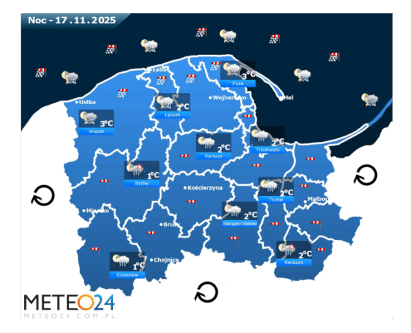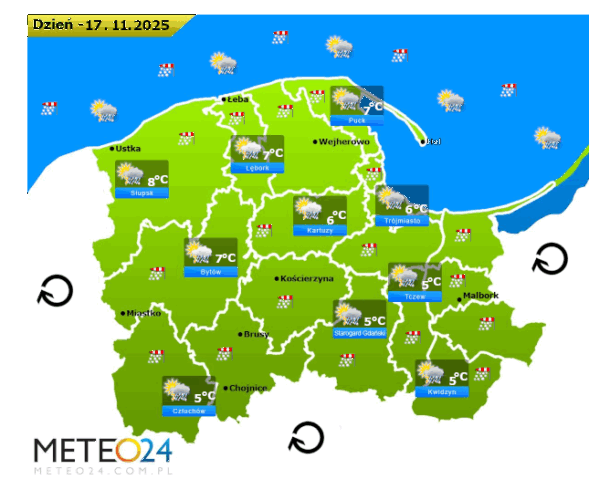 Z kolei w poniedziałek przed południem oraz w ciągu dnia i wieczorem na Pomorzu i Wybrzeżu nadal mogą rozwijać się silne marznące mgły i zamglenia. Poza tym utrzyma się z nami umiarkowane i duże zachmurzenie z przejaśnieniami, które przyniesie ze sobą kolejne przelotne oraz ciągłe opady marznącego deszczu i deszczu ze śniegiem o zmiennym i silnym natężeniu. Dodatkowo niewykluczone są też lokalne burze śnieżne oraz z opadami gradu lub krupy śnieżnej. Temperatura powietrza wyniesie od +5°C do +8°C. Wiatr na ogół będzie umiarkowany i dość silny ze zmiennych kierunków z przewagą wiejący od południowego – zachodu oraz z zachodu i północnego – zachodu. W zamian tego w porywach będzie on dochodzić do 40-60 km/h. Ciśnienie atmosferyczne w kolejnych godzinach ponownie będzie powoli rosnąć oraz w południe na poziomie morza wskaże 1001 hPa.