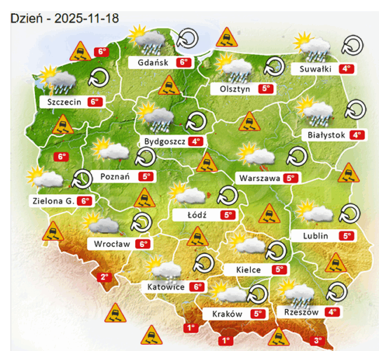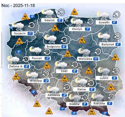 Z kolei we wtorek przed południem oraz w ciągu dnia i wieczorem w całym naszym kraju oraz nad morzem i w górach ponownie mogą rozwijać się silne marznące mgły i zamglenia. Poza tym utrzyma się z nami umiarkowane i duże zachmurzenie z przejaśnieniami, które jedynie nad wodami Morza Bałtyckiego oraz na północy i południowym wschodzie Polski przyniesie ze sobą kolejne przelotne oraz ciągłe opady marznącego deszczu jak i deszczu ze śniegiem o słabym i silnym natężeniu. Dodatkowo na tym obszarze niewykluczone są też burze śnieżne oraz z opadami gradu lub krupy śnieżnej. Temperatura powietrza wyniesie od +1°C do +6°C. Wiatr na ogół będzie słaby oraz umiarkowany i dość silny ze zmiennych kierunków z przewagą wiejący od południowego – zachodu oraz z północnego – zachodu i południowego – wschodu. W zamian tego w porywach będzie on dochodzić do 30-60 km/h. Ciśnienie atmosferyczne w kolejnych godzinach ponownie zacznie powoli spadać oraz w południe w Warszawie nad poziomem morza wskaże 1013 hPa.