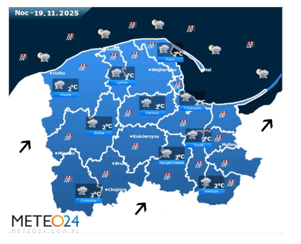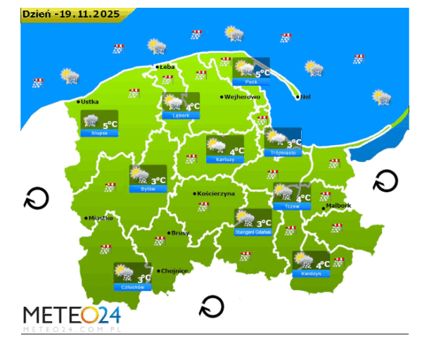 Z kolei w środę przed południem oraz w ciągu dnia i wieczorem na Pomorzu i Wybrzeżu ponownie mogą rozwijać się silne marznące mgły i zamglenia. Poza tym pojawi się całkowite oraz umiarkowane i duże zachmurzenie z przejaśnieniami, które przyniesie ze sobą kolejne przelotne oraz ciągłe opady śniegu i deszczu ze śniegiem o słabym i silnym natężeniu. Dodatkowo nad wodami Morza Bałtyckiego i w pasie nadmorskim niewykluczone są też burze śnieżne oraz z opadami gradu lub krupy śnieżnej. Temperatura powietrza wyniesie od +3°C do +5°C. Wiatr na ogół będzie słaby oraz umiarkowany i dość silny ze zmiennych kierunków z przewagą wiejący od południowego – zachodu oraz z południa i południowego – wschodu. W zamian tego w porywach będzie on dochodzić do 30-60 km/h. Ciśnienie atmosferyczne w kolejnych godzinach nadal będzie powoli spadać i się wahać oraz w południe na poziomie morza wskaże 1008 hPa.