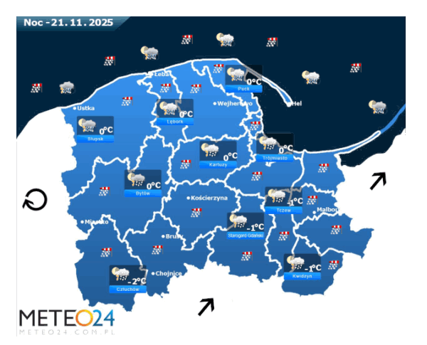 Natomiast w czwartek wieczorem oraz w piątek w ciągu nocy i o poranku na Pomorzu i Wybrzeżu nadal mogą rozwijać się silne marznące mgły i zamglenia. W zamian tego utrzyma się z nami całkowite oraz umiarkowane i duże zachmurzenie z przejaśnieniami, które przyniesie ze sobą przelotne oraz ciągłe opady marznącego deszczu jak i też deszczu ze śniegiem i śniegu. Dodatkowo niewykluczone są również lokalne burze śnieżne oraz z opadami gradu lub krupy śnieżnej. Temperatura powietrza wyniesie od -2°C do 0°C. Wiatr na ogół będzie umiarkowany i dość silny z południowego – zachodu i ze zmiennych kierunków z przewagą wiejący od zachodu i z północnego – zachodu. Poza tym w porywach będzie on dochodzić do 50-60 km/h. Ciśnienie atmosferyczne w kolejnych godzinach wyraźnie będzie się wahać i bardzo powoli rosnąć oraz o północy na poziomie morza wskaże 1006 hPa.