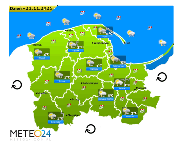 Z kolei w piątek przed południem oraz w ciągu dnia i wieczorem na Pomorzu i Wybrzeżu nadal mogą rozwijać się silne marznące mgły i zamglenia. Poza tym utrzyma się z nami umiarkowane i duże zachmurzenie z przejaśnieniami, które przyniesie ze sobą kolejne przelotne oraz ciągłe opady marznącego deszczu jak i też deszczu ze śniegiem i śniegu o zmiennym i silnym natężeniu. Dodatkowo niewykluczone są również lokalne burze śnieżne oraz z opadami gradu lub krupy śnieżnej. Temperatura powietrza wyniesie od +2°C do +6°C. Wiatr na ogół będzie słaby oraz umiarkowany i dość silny ze zmiennych kierunków z przewagą wiejący od północnego – zachodu oraz z południowego – zachodu i zachodu. W zamian tego w porywach będzie on dochodzić do 30-60 km/h. Ciśnienie atmosferyczne w kolejnych godzinach nadal będzie rosnąć oraz w południe na poziomie morza wskaże 1013 hPa.