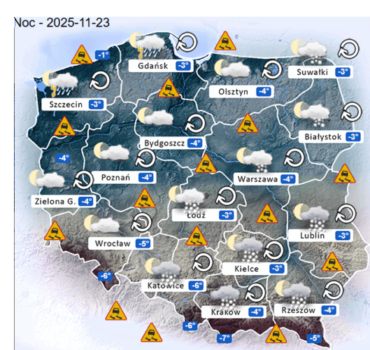 Z kolei w ostatni dzień weekendu przed południem oraz w ciągu dnia i wieczorem w całym naszym kraju oraz nad morzem i w górach nadal mogą rozwijać silne marznące mgły i zamglenia. Poza tym utrzyma się z nami całkowite oraz umiarkowane i duże zachmurzenie z przejaśnieniami, które przyniesie ze sobą kolejne przelotne oraz ciągłe opady marznącego deszczu i śniegu o słabym i silnym natężeniu. Dodatkowo nad wodami Morza Bałtyckiego niewykluczone są również lokalne burze z gradem lub krupą śnieżną. Jedynie bez opadów i burz powinno być częściowo na zachodzie Polski. Temperatura powietrza wyniesie od -4°C do +3°C. Wiatr na ogół będzie słaby oraz umiarkowany i dość silny ze zmiennych kierunków z przewagą wiejący od południowego – zachodu oraz z południowego – wschodu i północy. W zamian tego w porywach będzie on dochodzić do 30-60 km/h. Ciśnienie atmosferyczne w kolejnych godzinach nadal będzie spadać oraz w południe w Warszawie nad poziomem morza wskaże 1013 hPa.