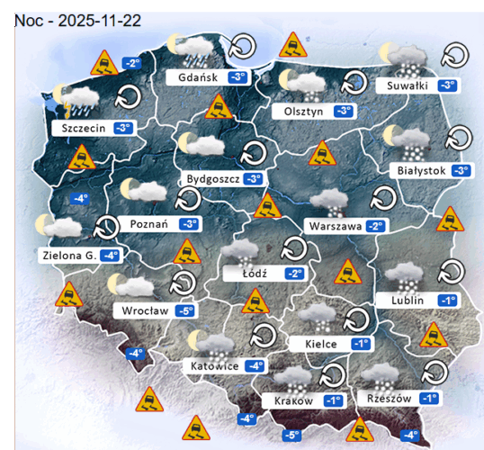 Natomiast w piątek wieczorem oraz w sobotę w ciągu nocy i o poranku w całym naszym kraju oraz nad morzem i w górach ponownie mogą rozwijać się silne marznące mgły i zamglenia. W zamian tego utrzyma się z nami całkowite oraz umiarkowane i duże zachmurzenie z przejaśnieniami, które przyniesie ze sobą przelotne oraz ciągłe opady marznącego deszczu jak i też deszczu ze śniegiem i śniegu o słabym i silnym natężeniu. Dodatkowo częściowo nad wodami Morza Bałtyckiego niewykluczone są również lokalne burze śnieżne oraz z opadami gradu lub krupy śnieżnej. Jedynie bez opadów i burz powinno być częściowo na zachodzie i północy Polski. Temperatura powietrza wyniesie od -5°C do -1°C. Wiatr na ogół będzie słaby oraz umiarkowany i dość silny ze zmiennych kierunków z przewagą wiejący od północnego – zachodu oraz z północy i południowego – zachodu. Poza tym w porywach będzie on dochodzić do 30-60 km/h. Ciśnienie atmosferyczne w kolejnych godzinach będzie rosnąć oraz o północy w Warszawie nad poziomem morza wskaże 1021 hPa.