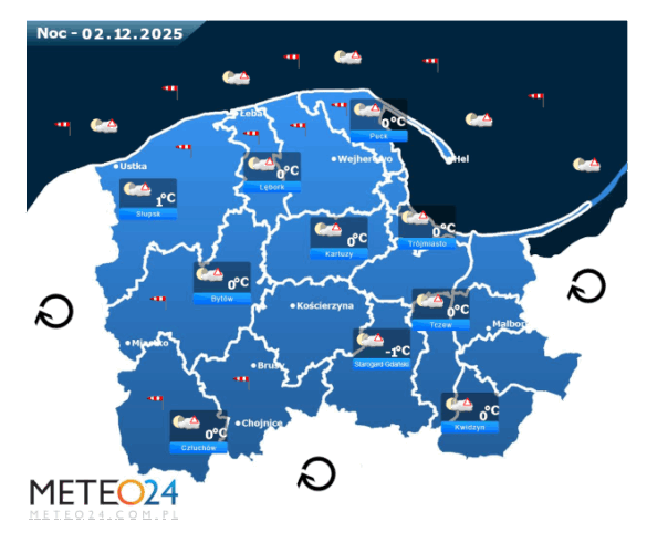 Natomiast w poniedziałek wieczorem oraz we wtorek w ciągu nocy i o poranku na Pomorzu i Wybrzeżu nadal mogą rozwijać się silne marznące mgły i zamglenia. Poza tym będzie bez opadów oraz między innymi utrzyma się z nami umiarkowane i duże zachmurzenie z przejaśnieniami. Temperatura powietrza wyniesie od -1°C do +1°C. Wiatr na ogół będzie słaby oraz umiarkowany i silny ze zmiennych kierunków z przewagą wiejący od południowego – zachodu oraz z południa i południowego – wschodu. Dodatkowo w porywach będzie on dochodzić do 60-80 km/h. Ciśnienie atmosferyczne w kolejnych godzinach będzie powoli rosnąć oraz o północy na poziomie morza wskaże 1021 hPa.