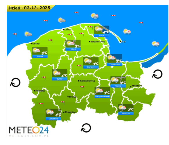 Z kolei we wtorek przed południem oraz w ciągu dnia i wieczorem na Pomorzu i Wybrzeżu nadal mogą rozwijać się silne marznące mgły i zamglenia. Poza tym utrzyma się z nami umiarkowane i duże zachmurzenie z przejaśnieniami, które przyniesie ze sobą przelotne oraz ciągłe opady marznącego deszczu lub mżawki marznącej o słabym i zmiennym natężeniu. Jedynie bez opadów powinno być na zachodzie i północy województwa. Temperatura powietrza wyniesie od +2°C do +5°C. Wiatr na ogół będzie słaby oraz umiarkowany i silny ze zmiennych kierunków z przewagą wiejący od południa oraz z południowego – wschodu i południowego – zachodu. Dodatkowo w porywach będzie on dochodzić do 60-80 km/h. Ciśnienie atmosferyczne w kolejnych godzinach będzie dość wysokie i wahające oraz w południe na poziomie morza wskaże 1021 hPa.