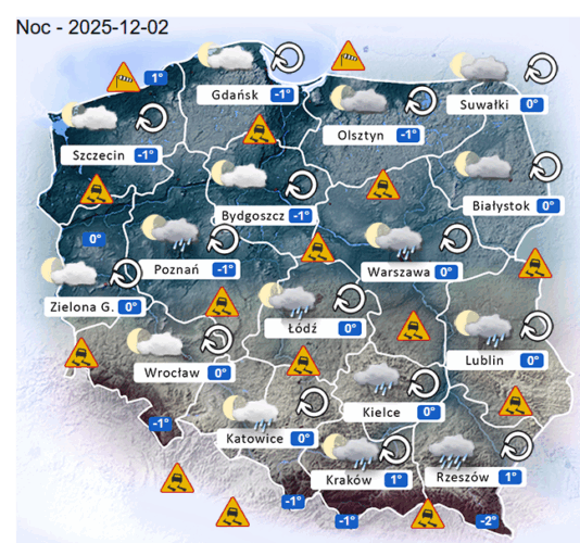 Natomiast w poniedziałek wieczorem oraz we wtorek w ciągu nocy i o poranku w całym naszym kraju oraz nad morzem i w górach ponownie możliwe są silne marznące mgły i zamglenia. W zamian tego utrzyma się z nami całkowite oraz umiarkowane i duże zachmurzenie z przejaśnieniami, które przyniesie ze sobą przelotne oraz ciągłe opady marznącego deszczu lub mżawki marznącej o słabym i silnym natężeniu. Jedynie bez opadów powinno być częściowo na zachodzie i północy Polski. Temperatura powietrza wyniesie od -2°C do +1°C. Wiatr na ogół będzie słaby oraz umiarkowany i silny ze zmiennych kierunków z przewagą wiejący od południowego – zachodu oraz z południowego – wschodu i północnego – zachodu. Dodatkowo w porywach będzie on dochodzić do 60-80 km/h. Ciśnienie atmosferyczne w kolejnych godzinach będzie rosnąć oraz o północy w Warszawie nad poziomem morza wskaże 1022 hPa.