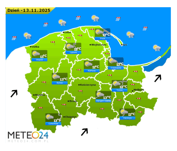Z kolei w czwartek przed południem oraz w ciągu dnia i wieczorem na Pomorzu i Wybrzeżu nadal mogą rozwijać się silne mgły i zamglenia. Poza tym utrzyma się z nami duże zachmurzenie z przejaśnieniami, które jedynie nad wodami Morza Bałtyckiego i w pasie nadmorskim przyniesie ze sobą kolejne przelotne oraz ciągłe opady deszczu jak i deszczu ze śniegiem o zmiennym i silnym natężeniu. Dodatkowo na tym obszarze niewykluczone są też lokalne burze śnieżne oraz z opadami gradu lub krupy śnieżnej. Temperatura powietrza wyniesie od +12°C do +13°C. Wiatr na ogół będzie umiarkowany i silny z południowego – zachodu. W zamian tego w porywach będzie on dochodzić do 60-80 km/h. Ciśnienie atmosferyczne w kolejnych godzinach nadal będzie spadać oraz w południe na poziomie morza wskaże 1009 hPa.