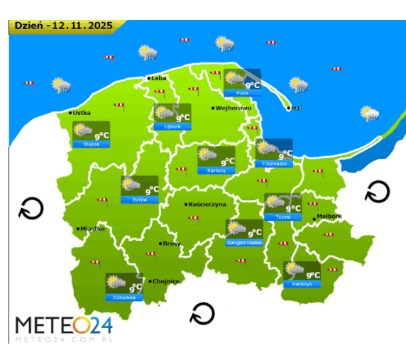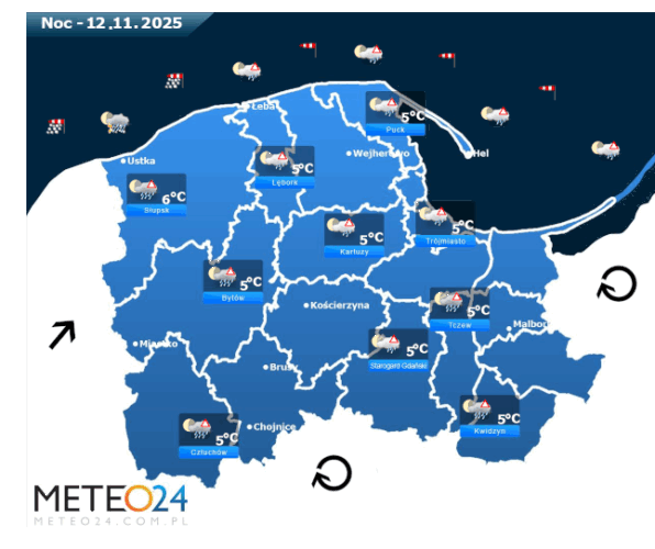W kolejnych godzinach a dokładnie w środę pogodę na Pomorzu i Wybrzeżu kształtować będzie układ niskiego ciśnienia z frontami atmosferycznymi. Poza tym do północnej części Polski i nad wody Morza Bałtyckiego nadal napływać będzie wilgotne i chłodne powietrze z północnego zachodu i południowego zachodu Europy.