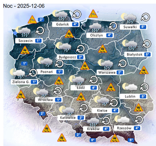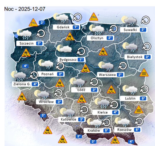 Z kolei w ostatni dzień weekendu przed południem oraz w ciągu dnia i wieczorem w całym naszym kraju oraz nad morzem i w górach nadal mogą rozwijać się silne marznące mgły i zamglenia. Poza tym utrzyma się z nami całkowite oraz umiarkowane i duże zachmurzenie z przejaśnieniami, które przyniesie ze sobą kolejne przelotne oraz ciągłe opady marznącego deszczu lub mżawki marznącej o słabym i silnym natężeniu. Jedynie bez opadów powinno być w Centrum i na wschodzie Polski. Temperatura powietrza wyniesie od +5°C do +8°C. Wiatr na ogół będzie słaby oraz umiarkowany i dość silny ze zmiennych kierunków z przewagą wiejący od południa oraz z południowego – zachodu i południowego – wschodu. Dodatkowo w porywach będzie on dochodzić do 30-60 km/h. Ciśnienie atmosferyczne w kolejnych godzinach nadal będzie się wahać oraz w południe w Warszawie nad poziomem morza wskaże 1015 hPa.