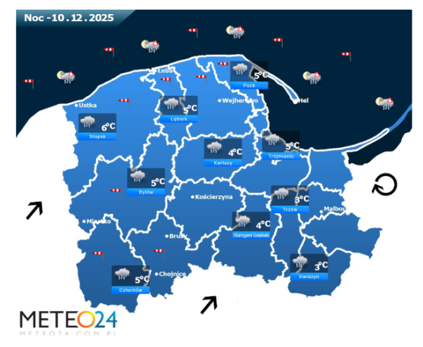 Natomiast we wtorek wieczorem oraz w środę w ciągu nocy i o poranku na Pomorzu i Wybrzeżu nadal mogą rozwijać się silne marznące mgły i zamglenia. Poza tym utrzyma się z nami całkowite i duże zachmurzenie z przejaśnieniami, które przyniesie ze sobą przelotne oraz ciągłe opady marznącego deszczu o zmiennym i silnym natężeniu. Temperatura powietrza wyniesie od +3°C do +6°C. Wiatr na ogół będzie umiarkowany i silny z południowego – zachodu i ze zmiennych kierunków z przewagą wiejący od zachodu i z południa. Dodatkowo w porywach będzie on dochodzić do 60-80 km/h. Ciśnienie atmosferyczne w kolejnych godzinach będzie się wahać i powoli spadać oraz o północy na poziomie morza wskaże 1013 hPa.