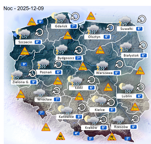 Natomiast w poniedziałek wieczorem oraz we wtorek w ciągu nocy i o poranku w całym naszym kraju oraz nad morzem i w górach nadal mogą rozwijać się silne marznące mgły i zamglenia. W zamian tego utrzyma się z nami całkowite i duże zachmurzenie z przejaśnieniami, które przyniesie ze sobą przelotne oraz ciągłe opady marznącego deszczu lub mżawki marznącej o słabym i silnym natężeniu. Dodatkowo nad wodami Morza Bałtyckiego oraz na zachodzie w Centrum i na północy Polski niewykluczone są też lokalne burze z gradem lub krupą śnieżną. Temperatura powietrza wyniesie od +2°C do +9°C. Wiatr na ogół będzie słaby oraz umiarkowany i silny ze zmiennych kierunków z przewagą wiejący od południowego – zachodu oraz z południa i południowego – wschodu. Poza tym w porywach będzie on dochodzić do 60-80 km/h. Ciśnienie atmosferyczne w kolejnych godzinach będzie się wahać i rosnąć oraz o północy w Warszawie nad poziomem morza wskaże 1018 hPa.