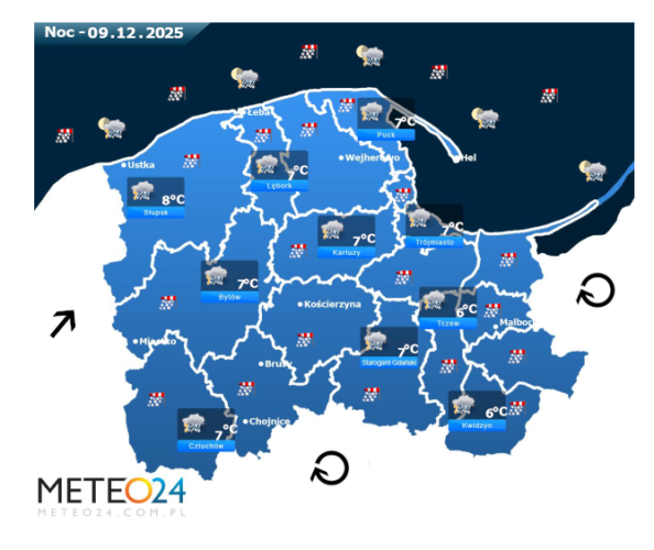 Z kolei we wtorek przed południem oraz ciągu dnia i wieczorem na Pomorzu i Wybrzeżu nadal mogą rozwijać się silne mgły i zamglenia. Poza tym utrzyma się z nami całkowite oraz umiarkowane i duże zachmurzenie z przejaśnieniami, które przyniesie ze sobą kolejne przelotne oraz ciągłe opady deszczu o zmiennym i silnym natężeniu. Dodatkowo niewykluczone są też lokalne burze z opadami gradu. Temperatura powietrza wyniesie w okolicach +10°C. Wiatr na ogół będzie słaby oraz umiarkowany i dość silny z południowego – zachodu. Dodatkowo w porywach będzie on dochodzić do 30-60 km/h. Ciśnienie atmosferyczne w kolejnych godzinach nadal będzie się wahać i rosnąć oraz w południe na poziomie morza wskaże 1011 hPa.