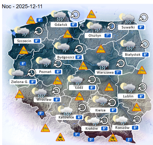 Z kolei w czwartek przed południem oraz w ciągu dnia i wieczorem w całym naszym kraju oraz nad morzem i w górach nadal możliwe są silne mgły i zamglenia. Poza tym utrzyma się z nami umiarkowane i duże zachmurzenie z przejaśnieniami, które przyniesie ze sobą kolejne przelotne oraz ciągłe opady deszczu lub mżawki o słabym i silnym natężeniu. Jedynie bez opadów powinno być częściowo na zachodzie i w Centrum Polski. Temperatura powietrza wyniesie od +6°C do +11°C. Wiatr na ogół będzie słaby oraz umiarkowany i silny ze zmiennych kierunków z przewagą wiejący od południowego – zachodu oraz z zachodu i północnego – zachodu. Dodatkowo w porywach będzie on dochodzić do 60-80 km/h. Ciśnienie atmosferyczne w kolejnych godzinach nadal będzie wyraźnie się wahać oraz w południe w Warszawie nad poziomem morza wskaże 1019 hPa.