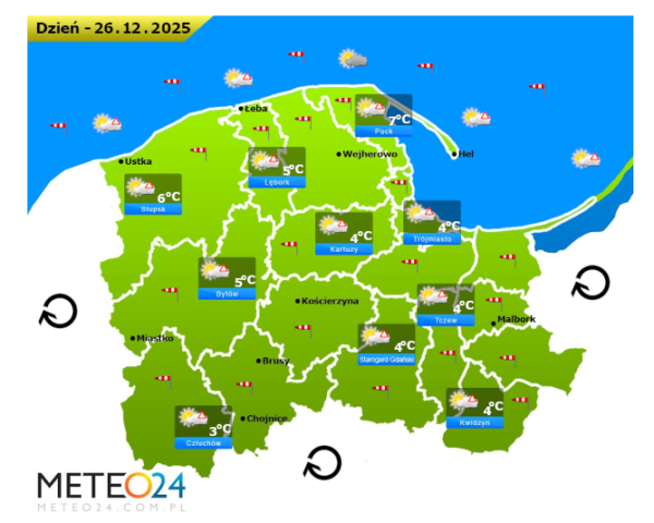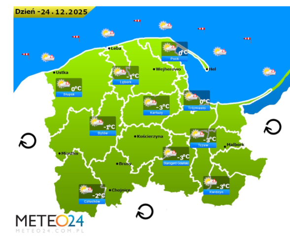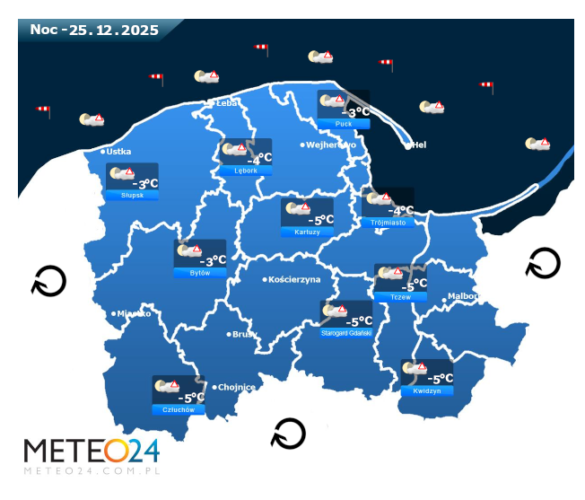 Z kolei w pierwszy dzień Świąt Bożego Narodzenia a dokładnie w czwartek przed południem oraz w ciągu dnia i wieczorem na Pomorzu i Wybrzeżu nadal możliwe są silne marznące mgły i zamglenia. Poza tym będzie bez opadów oraz między innymi pojawi się umiarkowane i duże zachmurzenie z przejaśnieniami. Temperatura powietrza wyniesie od -2°C do +1°C. Wiatr na ogół będzie słaby oraz umiarkowany i silny ze zmiennych kierunków z przewagą wiejący od południowego – wschodu oraz z północnego – wschodu i południowego – zachodu. Dodatkowo na Bałtyku utrzyma się sztorm oraz w porywach tam i w pasie nadmorskim może on dochodzić do 60-100 km/h. Ciśnienie atmosferyczne w kolejnych godzinach będzie już spadać oraz w południe na poziomie morza wskaże 1037 hPa.