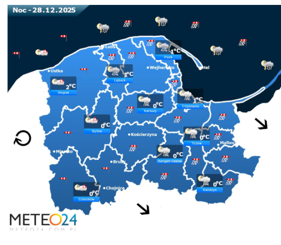 Natomiast w sobotę wieczorem oraz w ciągu nocy i o poranku w niedzielę nadal na Pomorzu i Wybrzeżu możliwe są silne marznące mgły i zamglenia. Poza tym utrzyma się z nami umiarkowane i duże zachmurzenie z przejaśnieniami, które przyniesie ze sobą przelotne oraz ciągłe opady marznącego deszczu jak i też deszczu ze śniegiem i mokrego śniegu o zmiennym i silnym natężeniu. Dodatkowo częściowo nad wodami Morza Bałtyckiego niewykluczone są również lokalne burze śnieżne oraz z opadami gradu lub krupy śnieżnej. Jedynie bez opadów powinno być w rejonie Ustki oraz na północnym zachodzie i zachodzie województwa. Temperatura powietrza wyniesie od 0°C do +2°C. Wiatr na ogół będzie umiarkowany oraz silny i porywisty z północnego – zachodu i ze zmiennych kierunków z przewagą wiejący od północy. Dodatkowo w porywach będzie on dochodzić do 70-100 km/h. Ciśnienie atmosferyczne w kolejnych godzinach nadal będzie rosnąć i się wahać oraz o północy na poziomie morza wskaże 1018 hPa.