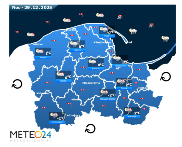 Natomiast w niedzielę wieczorem oraz noc z niedzieli na poniedziałek nadal mogą rozwijać się silne marznące mgły i zamglenia. W zamian tego utrzyma się z nami umiarkowane i duże zachmurzenie z przejaśnieniami, które przyniesie ze sobą przelotne opady marznącego deszczu i śniegu o zmiennym i silnym natężeniu. Dodatkowo częściowo nad wodami Morza Bałtyckiego niewykluczone są też lokalne burze śnieżne oraz z opadami gradu lub krupy śnieżnej. Jedynie bez opadów powinno być na północnym zachodzie i zachodzie województwa. Temperatura powietrza wyniesie od -2°C do +1°C. Wiatr na ogół będzie słaby oraz umiarkowany i silny ze zmiennych kierunków z przewagą wiejący od zachodu oraz z północnego – zachodu i południowego – zachodu. Poza tym w porywach będzie on dochodzić do 60-80 km/h. Ciśnienie atmosferyczne w kolejnych godzinach będzie się wahać i spadać oraz o północy na poziomie morza wskaże 1017 hPa.