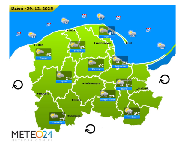 W kolejnych godzinach nowego tygodnia pogodę na Pomorzu i Wybrzeżu nadal kształtować będzie układ niskiego ciśnienia z frontami atmosferycznymi. Poza tym nad wody Morza Bałtyckiego i do północnej części Polski napływać będzie mroźne oraz bardzo zróżnicowane i wilgotne powietrze z północnego zachodu prosto północy Europy.
