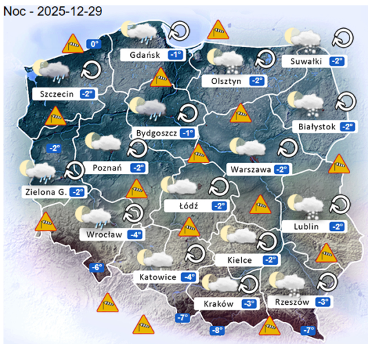 Z kolei w poniedziałek przed południem oraz w ciągu dnia i wieczorem w całym naszym kraju oraz nad morzem i w górach ponownie mogą rozwijać się silne marznące mgły i zamglenia. Poza tym pojawi się całkowite oraz umiarkowane i duże zachmurzenie z przejaśnieniami, które przyniesie ze sobą kolejne przelotne oraz ciągłe opady marznącego deszczu jak i też deszczu ze śniegiem i śniegu o zmiennym i silnym natężeniu. Dodatkowo niewykluczone są też lokalne burze śnieżne oraz z opadami gradu lub krupy śnieżnej. Temperatura powietrza wyniesie od -2°C do +5°C. Wiatr na ogół będzie słaby oraz umiarkowany i silny ze zmiennych kierunków z przewagą wiejący z przewagą wiejący od północnego – zachodu oraz z południowego – zachodu i północy. W zamian tego w porywach będzie on dochodzić do 60-90 km/h. Szczególnie najsilniejszy wiatr prognozowany jest na Bałtyku i w pasie nadmorskim. Ciśnienie atmosferyczne w kolejnych godzinach nadal będzie spadać oraz w południe w Warszawie nad poziomem morza wskaże 1010 hPa.