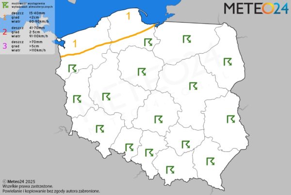 Opis: W ciągu doby szczególnie nad wodami Morza Bałtyckiego i w całym pasie nadmorskim będą rozwijać się pojedyncze komórki burzowe lub pasma konwekcyjne. Dodatkowo w tej części obszaru pojawią się również przelotne oraz ciągłe opady marznącego deszczu i mokrego śniegu o zmiennym i silnym natężeniu. W zamian tego podczas ich występowania niewykluczone są między innymi lokalne wyładowania atmosferyczne z opadami gradu lub krupy śnieżnej. Poza tym podczas przechodzenia masowej konwekcji w tej części omawianego obszaru wystąpi silny wiatr, który w porywach może tam dochodzić do 90 km/h. Z tego względu dla tego obszaru został wydany pierwszy stopień zagrożenia. Z kolei na przeważającym obszarze Polski i w górach również znad Bałtyku będą przemieszczać się rozproszone i pojedyncze też komórki konwekcyjne z opadami różnego rodzaju. Ponadto w tej części kraju możliwe są lokalne wyładowania atmosferyczne z umiarkowanym i silnym wiatrem w porywach do 60-80 km/h.
