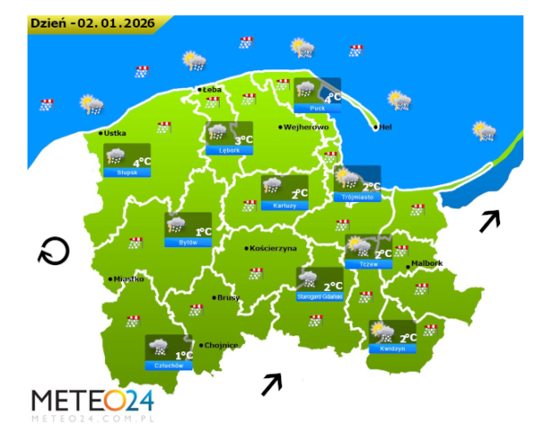 Natomiast w czwartek wieczorem oraz w piątek w ciągu nocy i o poranku na Pomorzu i Wybrzeżu nadal mogą rozwijać się silne marznące mgły i zamglenia. W zamian tego utrzyma się z nami całkowite i duże zachmurzenie z przejaśnieniami, które przyniesie ze sobą kolejne przelotne oraz ciągłe opady marznącego deszczu jak i też deszczu ze śniegiem i śniegu o zmiennym i silnym natężeniu. Dodatkowo nad wodami Morza Bałtyckiego i w północnej części województwa niewykluczone są burze śnieżne oraz z opadami gradu lub krupy śnieżnej. Temperatura powietrza wyniesie w okolicach 0°C. Wiatr na ogół będzie silny oraz bardzo silny i porywisty z południowego – zachodu i ze zmiennych kierunków z przewagą wiejący od północnego – zachodu. Poza tym w porywach będzie on dochodzić do 80-110 km/h. Ciśnienie atmosferyczne w kolejnych godzinach będzie spadać oraz o północy na poziomie morza wskaże 984 hPa.