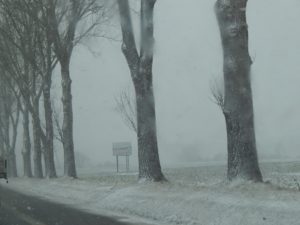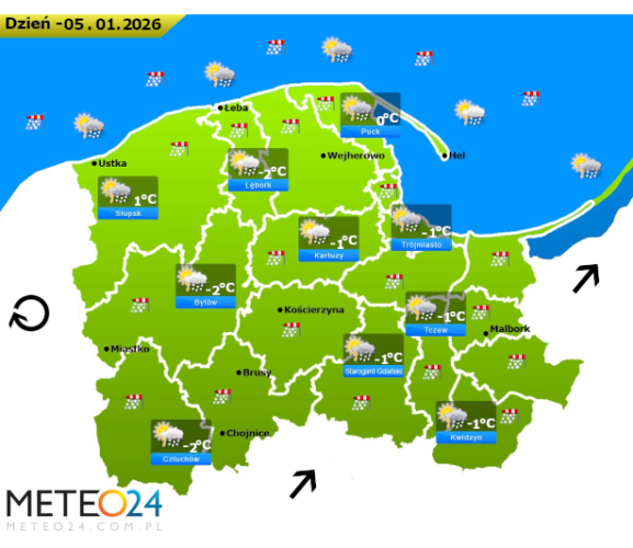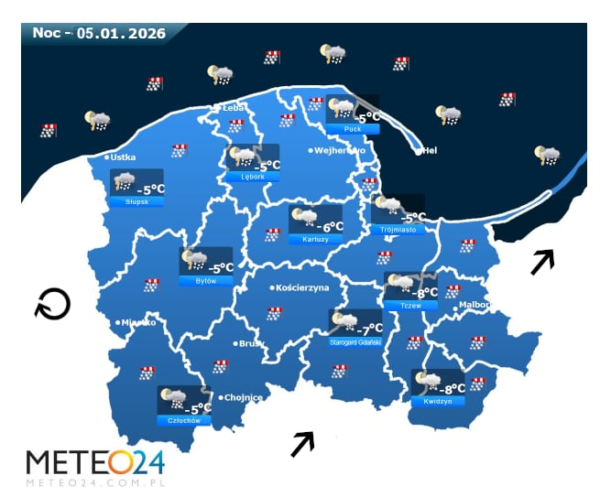 Z kolei w poniedziałek przed południem oraz w ciągu dnia i wieczorem na Pomorzu i Wybrzeżu ponownie mogą rozwijać się silne marznące mgły i zamglenia. Poza tym utrzyma się z nami umiarkowane i duże zachmurzenie z przejaśnieniami, które przyniesie ze sobą kolejne przelotne oraz ciągłe opady śniegu o zmiennym i bardzo silnym natężeniu. Dodatkowo niewykluczone są też burze śnieżne oraz z opadami gradu lub krupy śnieżnej. Temperatura powietrza wyniesie od -2°C do +1°C. Wiatr na ogół będzie słaby oraz umiarkowany i dość silny z południowego – zachodu i ze zmiennych kierunków z przewagą wiejący od zachodu i z północnego – zachodu. W zamian tego w porywach będzie on dochodzić do 30-60 km/h. Ciśnienie atmosferyczne w kolejnych godzinach nadal będzie rosnąć oraz w południe na poziomie morza wskaże 1012 hPa.