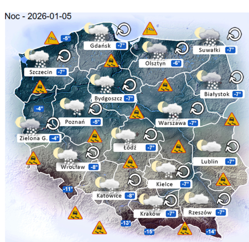 Natomiast w niedzielę wieczorem oraz w poniedziałek w ciągu nocy i o poranku w całym naszym kraju oraz nad morzem i w górach nadal możliwe są silne marznące mgły i zamglenia. Poza tym utrzyma się z nami umiarkowane i duże zachmurzenie z przejaśnieniami, które przyniesie ze sobą kolejne przelotne oraz ciągłe opady śniegu o słabym i bardzo silnym natężeniu. Dodatkowo nad wodami Morza Bałtyckiego i w pasie nadmorskim niewykluczone są burze śnieżne oraz z opadami gradu lub krupy śnieżnej. Jedynie bez opadów powinno być na wschodzie i południowym wschodzie Polski. Temperatura powietrza wyniesie od -15°C do -5°C. Wiatr na ogół będzie słaby oraz umiarkowany i silny ze zmiennych kierunków z przewagą wiejący od południowego – zachodu oraz z zachodu i północnego – zachodu. Poza tym w porywach będzie on dochodzić do 60-80 km/h. Ciśnienie atmosferyczne w kolejnych godzinach będzie rosnąć oraz o północy w Warszawie nad poziomem morza wskaże 1008 hPa.